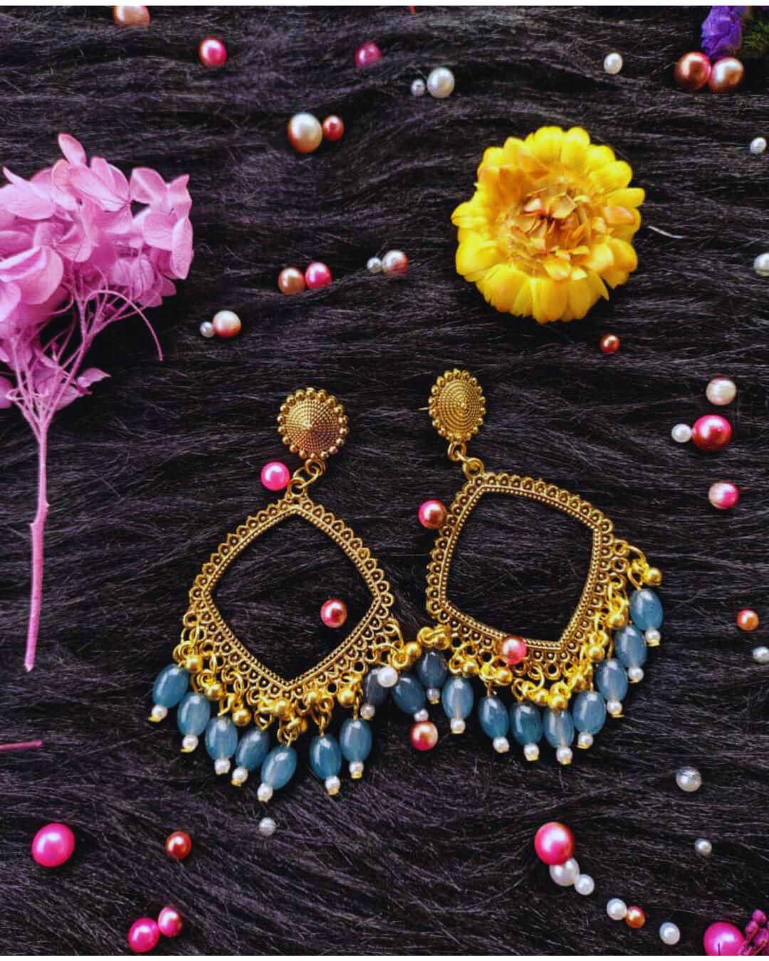 CompareGolden jhumka bezel with Marble Blue beads in Square shape