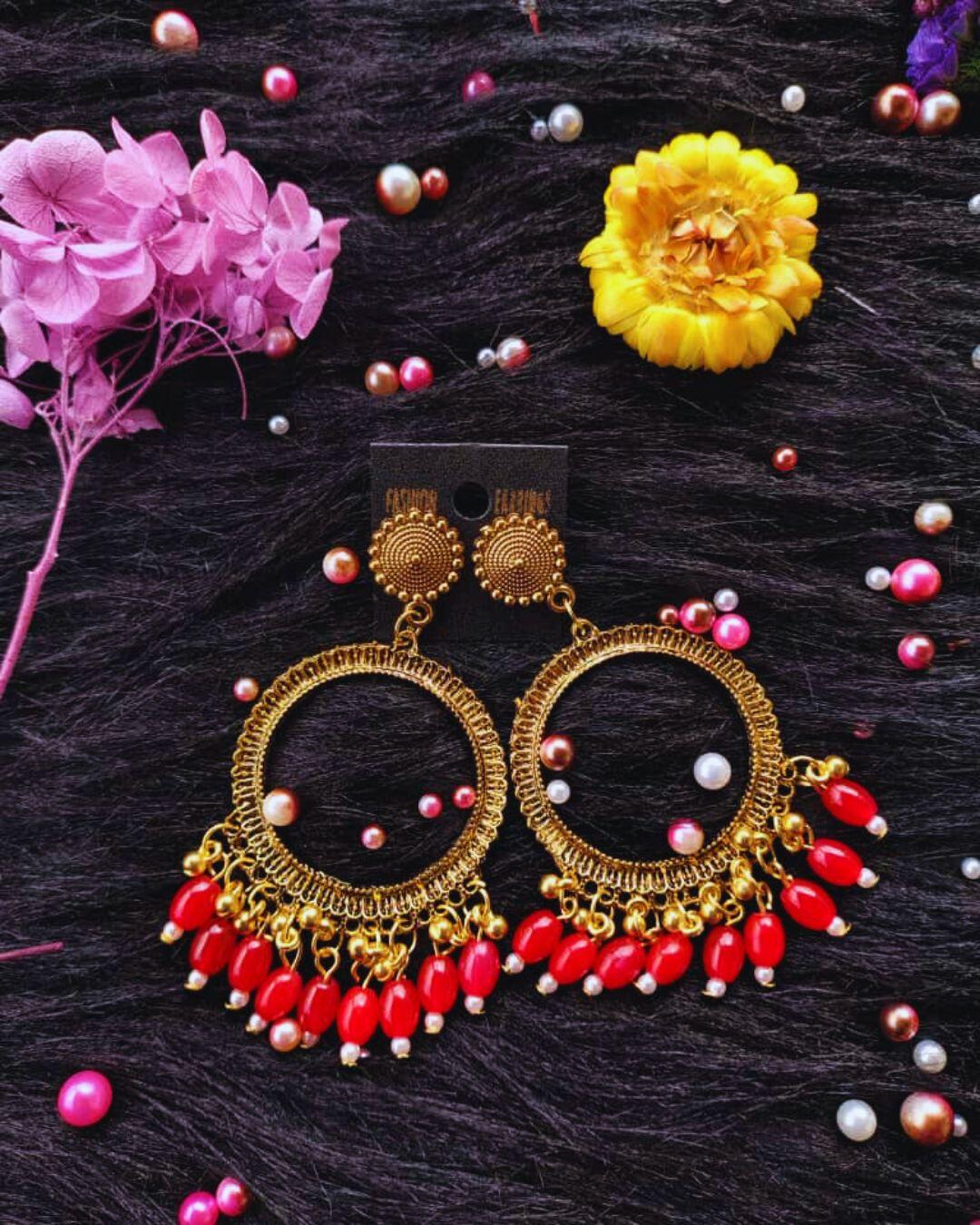 Golden jhumka bezel with Red beads in Round shape