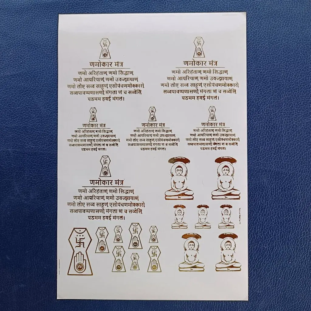 Enhance your creative and spiritual projects with this beautifully designed Namokar Mantra with Mahavir Ji Embossed Gold Sticker Sheet, specially crafted for resin art and DIY crafts. This sticker sheet features the sacred Namokar (Navkar) Mantra along with an elegant depiction of Mahavir Ji, bringing a divine and peaceful essence to your creations.