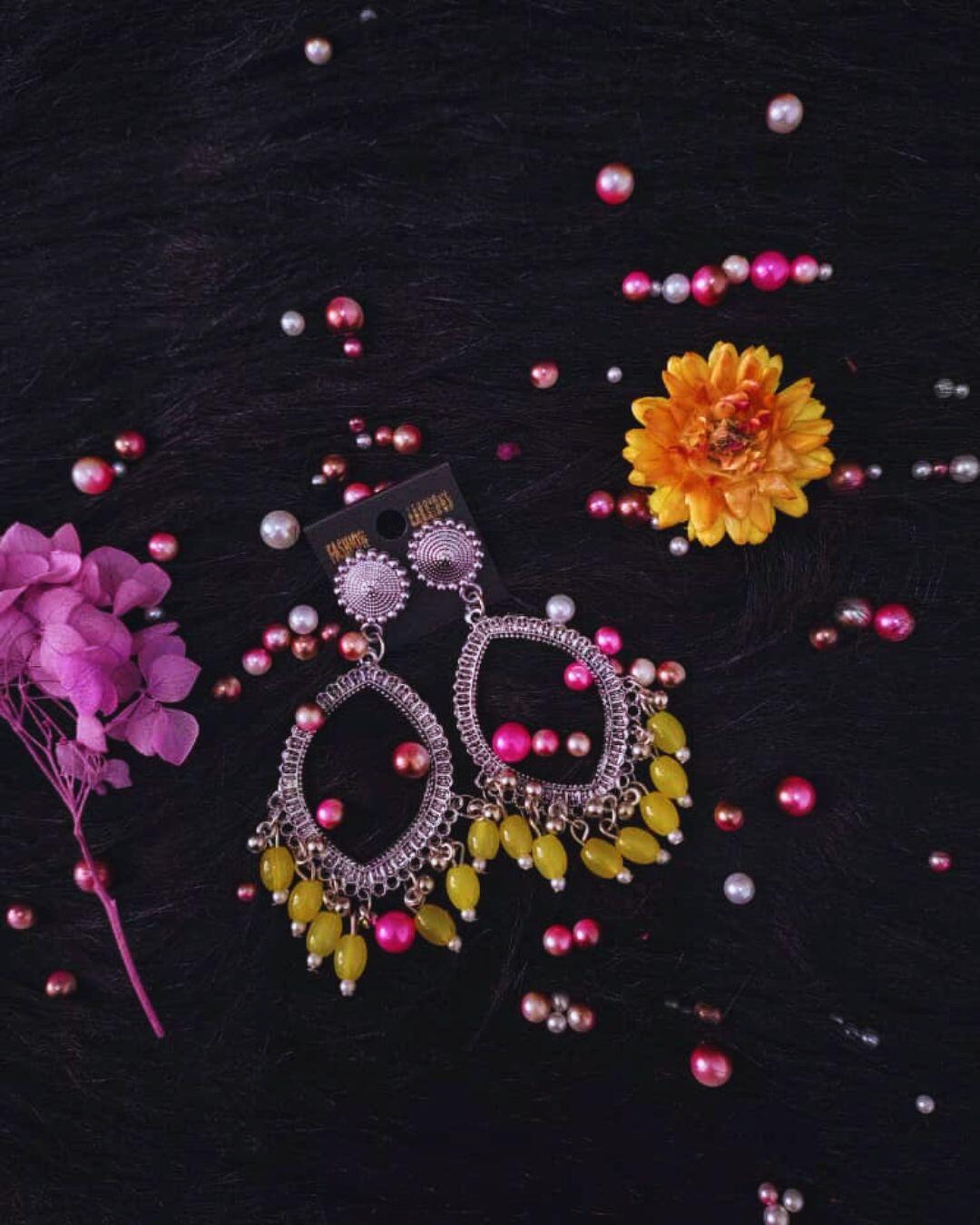 CompareSilver jhumka bezel with Lemon Yellow beads in Eye shape
