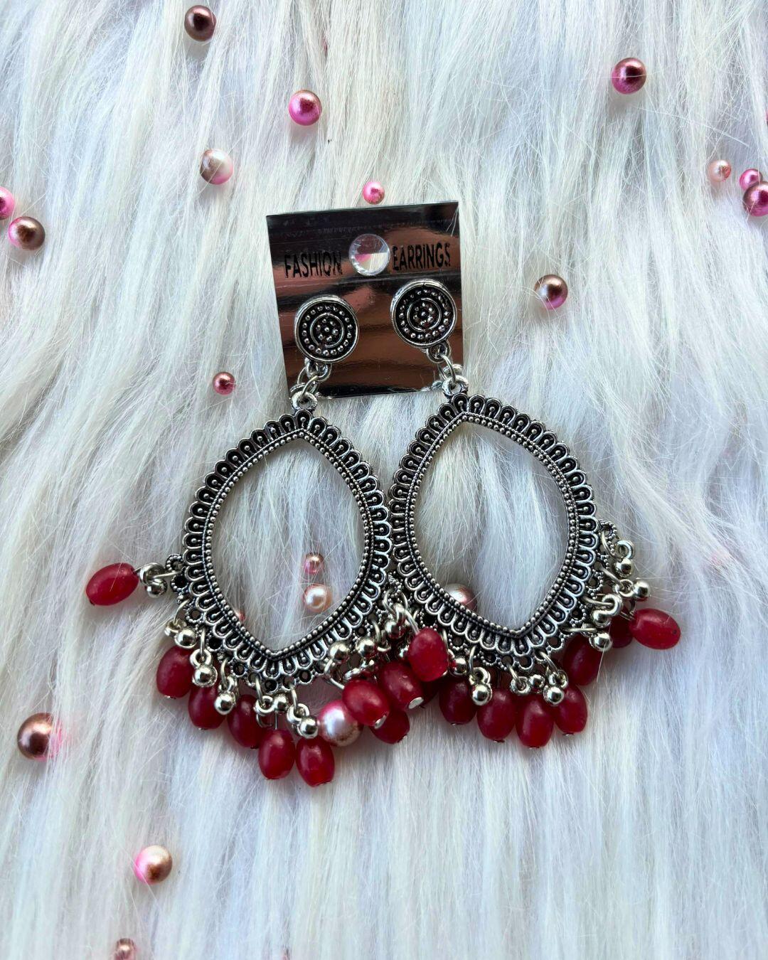 silver jhumka bezel with red beads in eyes shape