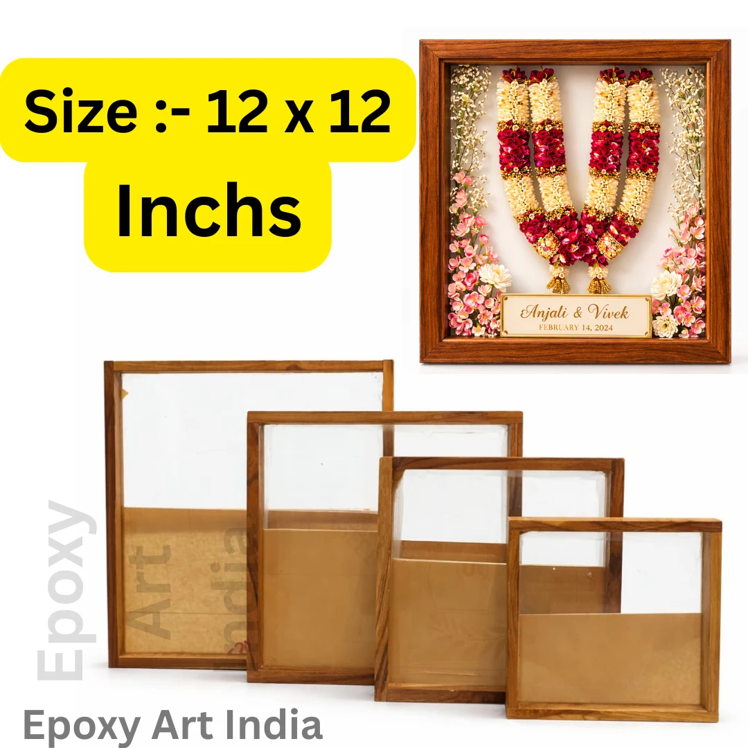 This 12 x 12 Inch Teakwood Floating Frame with Acrylic Base is ideal for preserving varmala flowers, resin art, and special memories. The natural teakwood frame with a clear acrylic base creates a beautiful floating effect that enhances the look of your artwork. Perfect for varmala preservation, resin art display, and home décor.